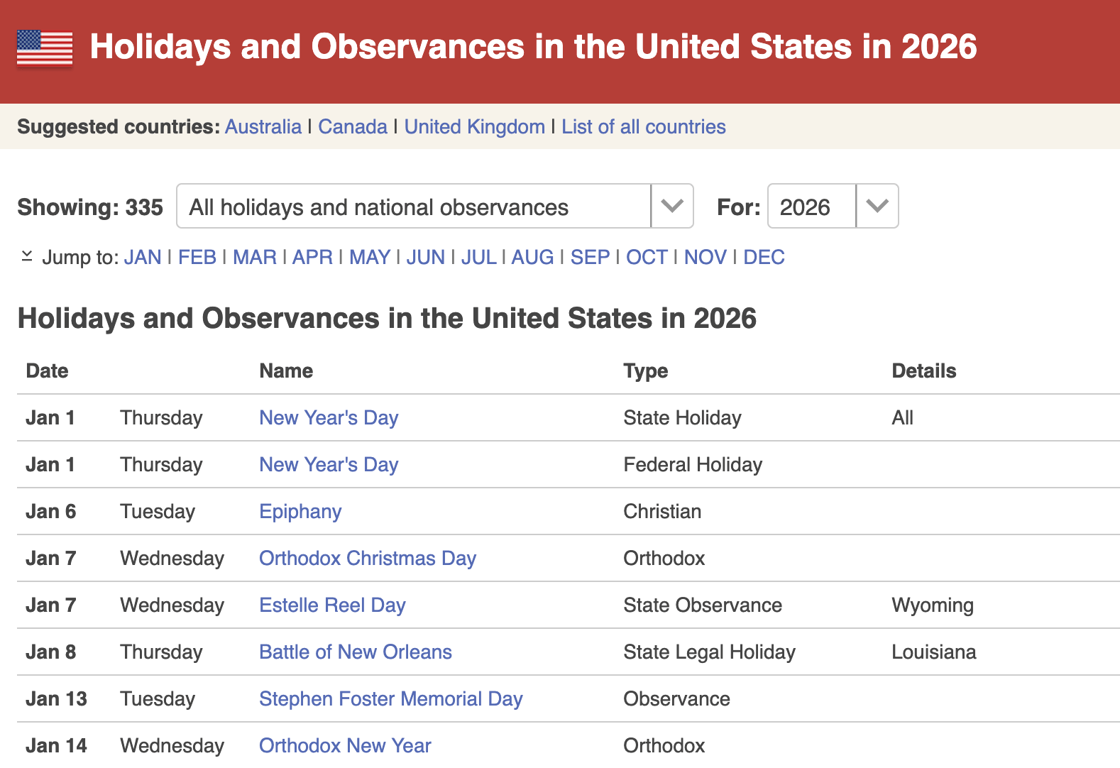 POV: Youāre planning ahead for Q1 2026 and want an Excel table of all the US holidays plus those fun observance days (Pizza Day, World Compliment Day, etc.) from January to March.