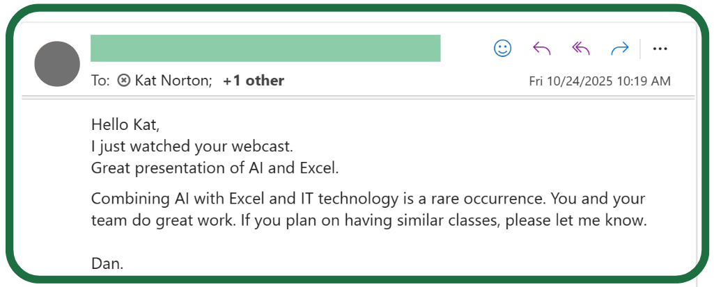 Iāve led over 100 Excel webinars. But this AI and Excel class? It was one of our best reviewed classes ever!