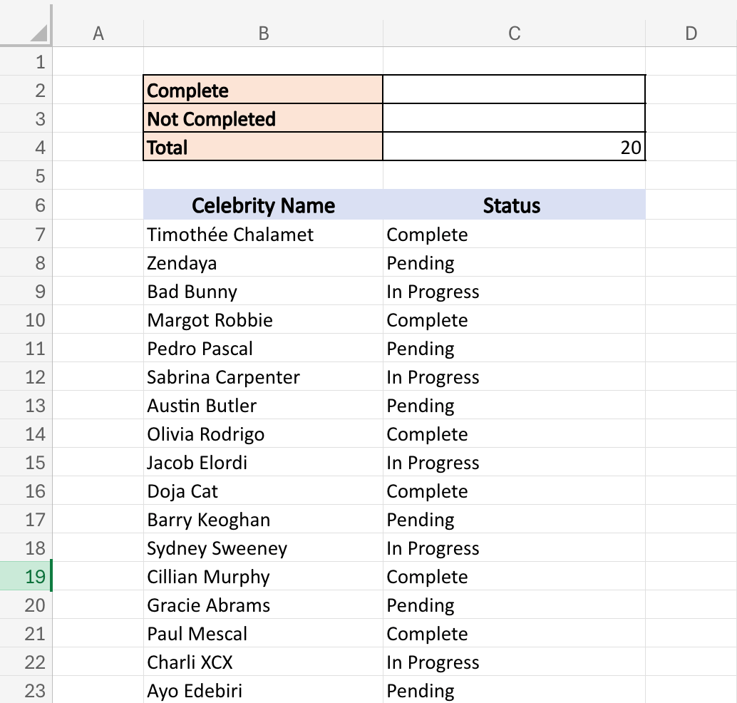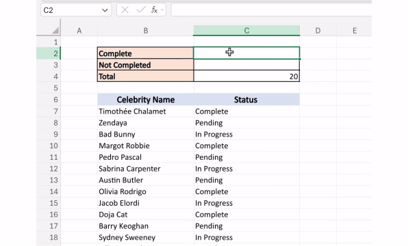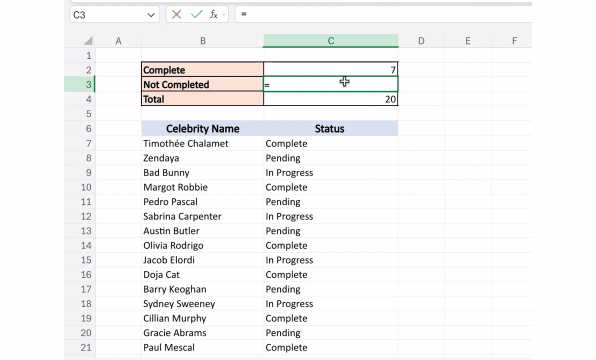 Voila! And if you wanted to count all the celebrities who havenāt won yet? Simple. Just use this formula: =COUNTIF(C7:C26,ā<>Completeā)
