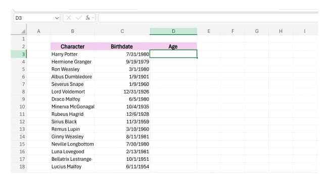 P.S. I tried to calculate Dumbledore's birthday (sometime in 1881), but Excel can only handle birthdates from 1900 onward. Guess Excel wasnât built for immortal wizards. đ§