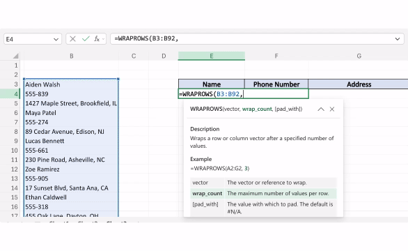 The good news is that the answer isn’t C (although we’ve all been there 😅). It’s WRAPROWS! This Excel function converts a single column into a clean, two-dimensional array. Think of it as the Marie Kondo of Excel formulas. 🧹